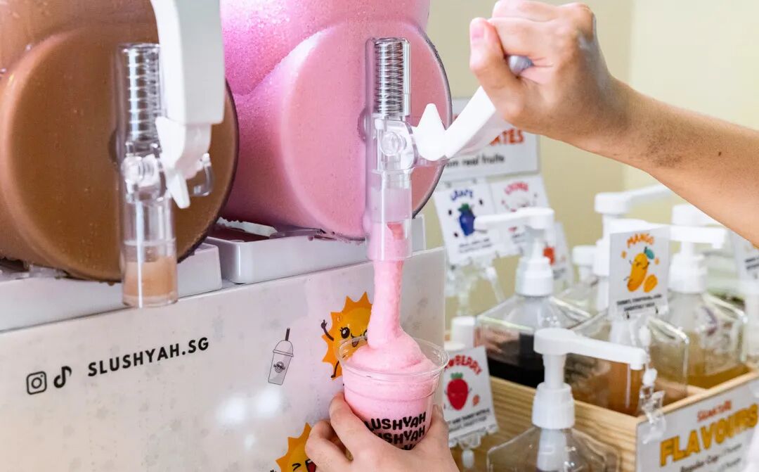 怕辣可去SCAPE 丁家铺旁的 Slushyah 喝冰沙降温,选杯(6.8-7.7 新元)后可任意搭配冰沙与配料,另有友好工作人员可提供建议。
