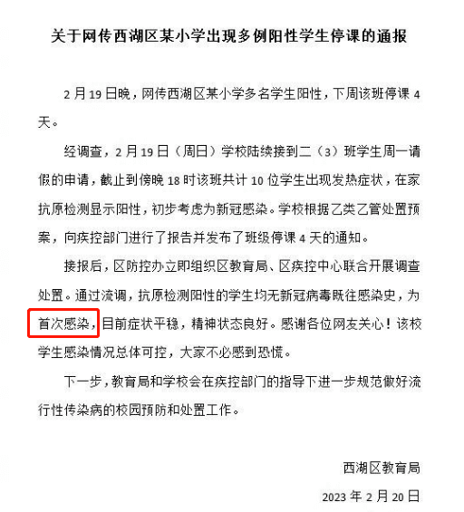 官方在第二天的公告中提到:这次感染新冠的学生们都是首次感染,并非二轮感染。